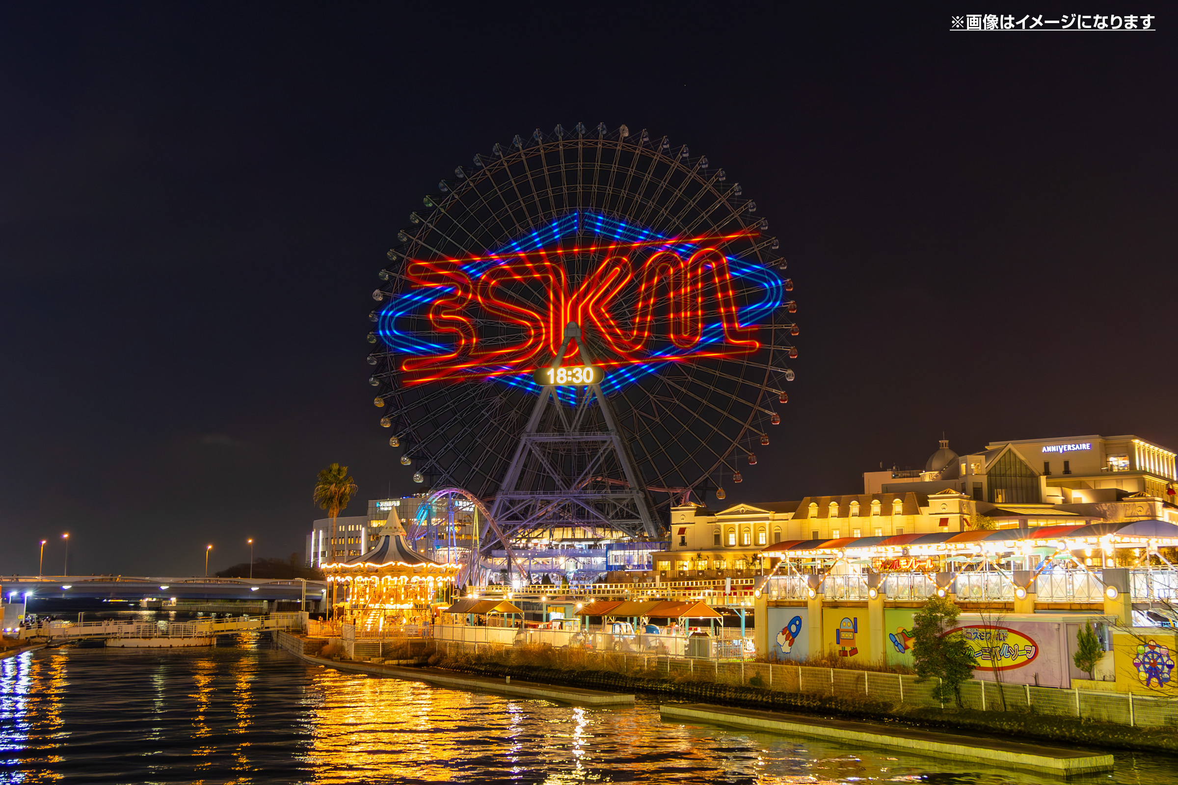 全高112.5mの世界最大の時計機能付き観覧車に現れる3SKMの姿を夜の横浜でお楽しみください。